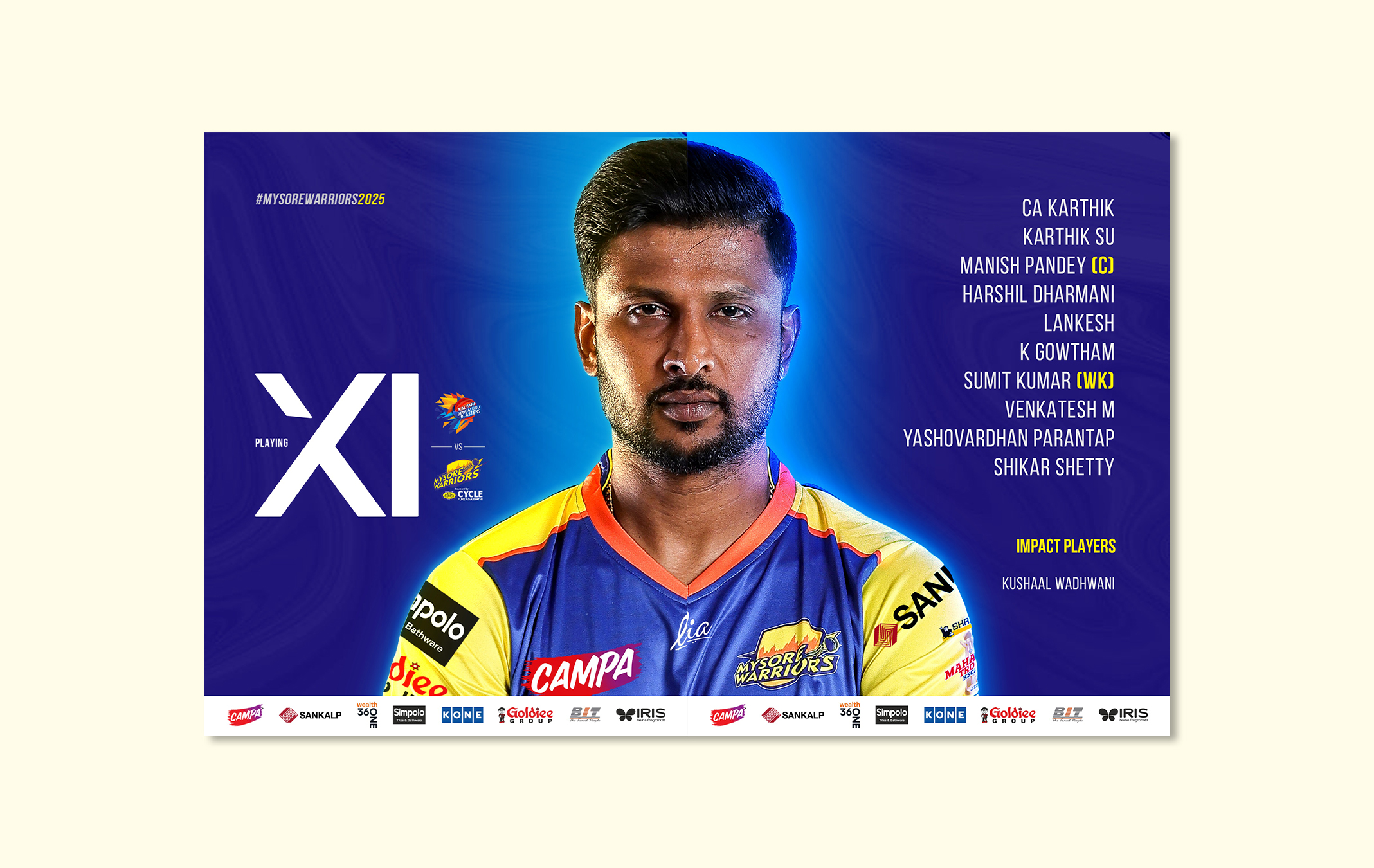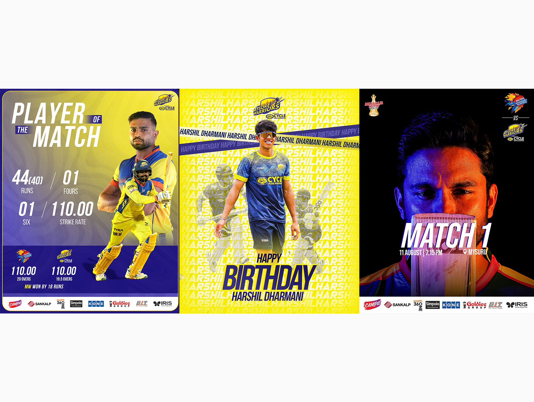 We designed and executed a series of high-energy social media posters and videos that brought the Mysore Warriors’ brand personality to life. Each creative piece combined bold visuals, dynamic motion graphics, and a consistent design language that resonated with fans. From pre-match hype posters to highlight reels and celebratory videos, our content strategy ensured fans stayed engaged, excited, and connected throughout the season.