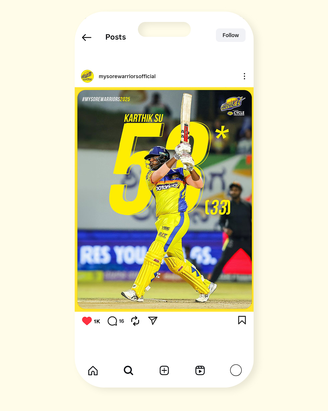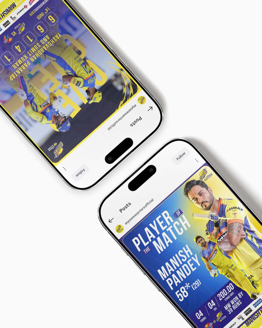 Cricket is more than a sport—it’s an emotion, and connecting with fans requires a digital-first approach. Mysore Warriors needed a stronger social media presence that not only showcased match updates and player highlights but also reflected the team’s vibrant identity and connected emotionally with their fanbase. Their existing content lacked the engaging visual storytelling required to amplify the team spirit online.